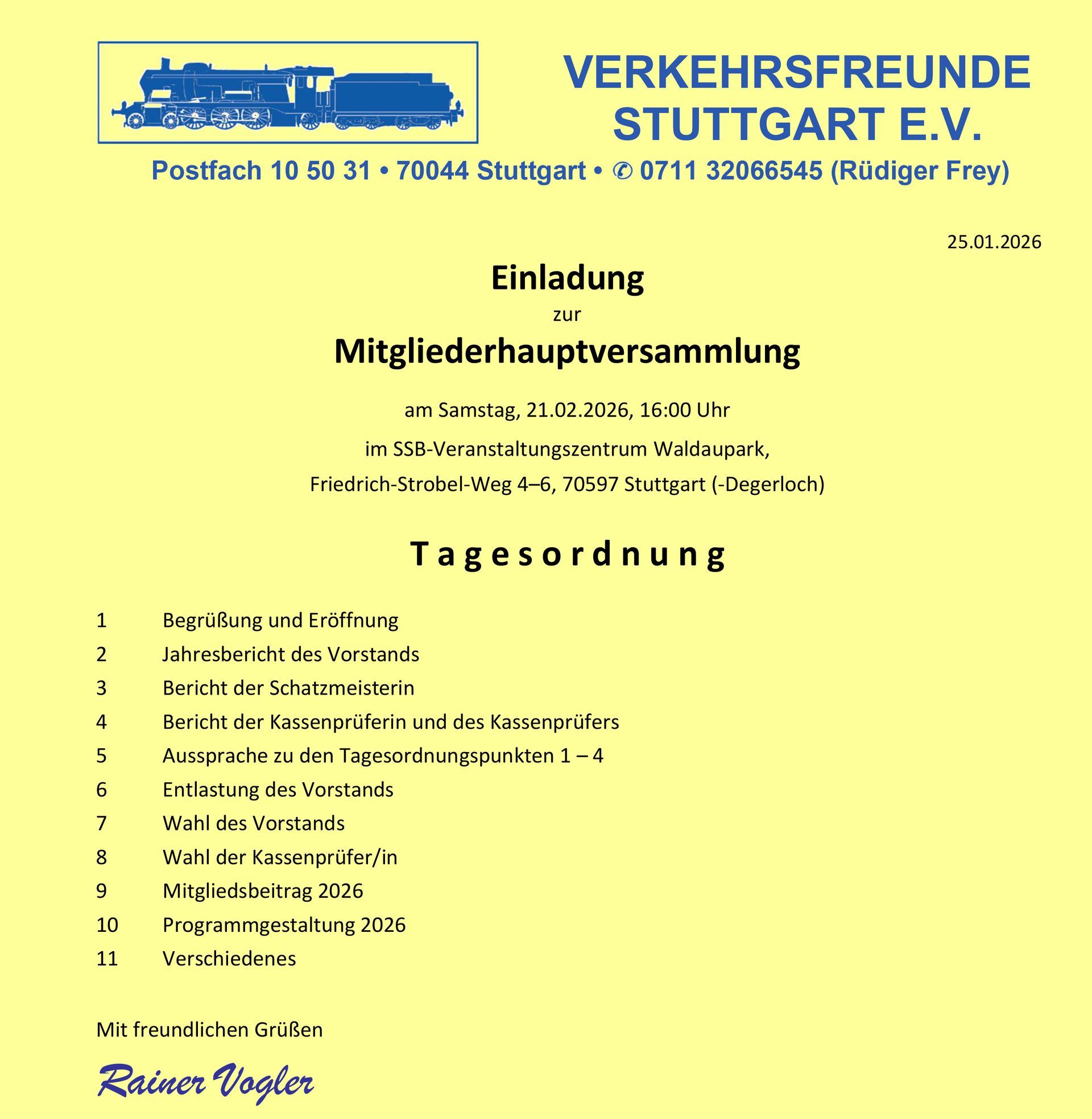 das heutige Rundschreiben enthält die Einladung zur Mitgliederhauptversammlung am Samstag, 21.02.2026. Der Vorstand der Verkehrsfreunde Stuttgart e.V. freut sich über eine rege Teilnahme und weist darauf hin, dass bei dieser Versammlung Vorstandswahlen anstehen. Ebenfalls angefügt ist unser momentan aktuelle Terminkalender 2026. Im Internet unter werden Aktualisierungen vorgenommen, sobald uns weitere Informationen vorliegen.